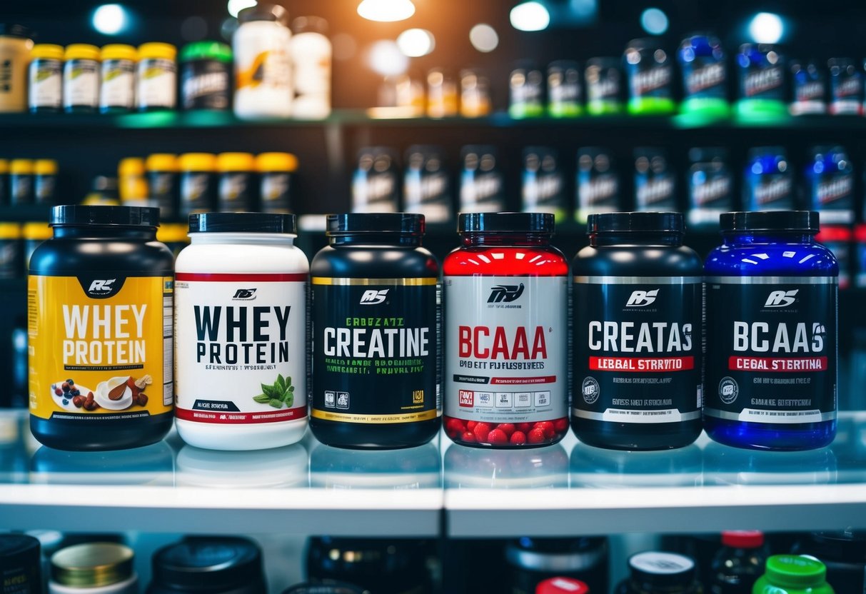 Whey protein is a commonly used supplement, providing a rich source of protein for muscle recovery. D-Aspartic Acid supports natural testosterone levels, indirectly promoting muscle gain and strength. Arginine assists in protein synthesis and increasing blood flow to muscles, facilitating enhanced performance and growth.
